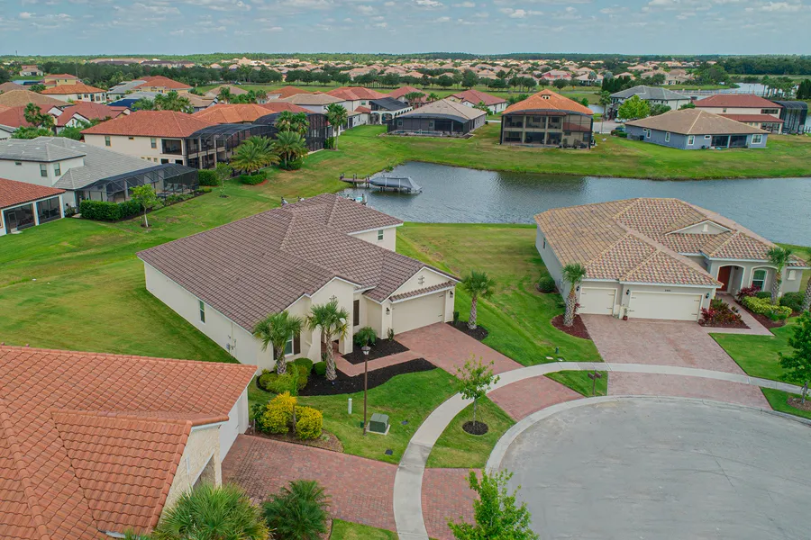 Location - Waterfront, cul-de-sac in a gated community! Masterful design and modern luxury are uniquely embodied in this 4-bedroom, 4-bath home with 2,970 sq. ft. located in the resort-style community of Bellalago. You will fall in love as soon as you walk in, as every detail was carefully selected and quality crafted. The wood tiled flooring flows seamlessly throughout the home with 12-ft ceilings. As you enter you are greeted by the home office with double glass doors and an art deco light fixture that adds beauty to the space. Perfect for entertaining friends or family, the home boasts a large Chef's kitchen with an oversized island with breakfast bar, light cabinets with crown molding that are fit to the ceiling giving so much storage space, double ovens and large pantry, and is open to the dining room and expansive living room with wood plank wall detail. The Owner's Retreat gives p...