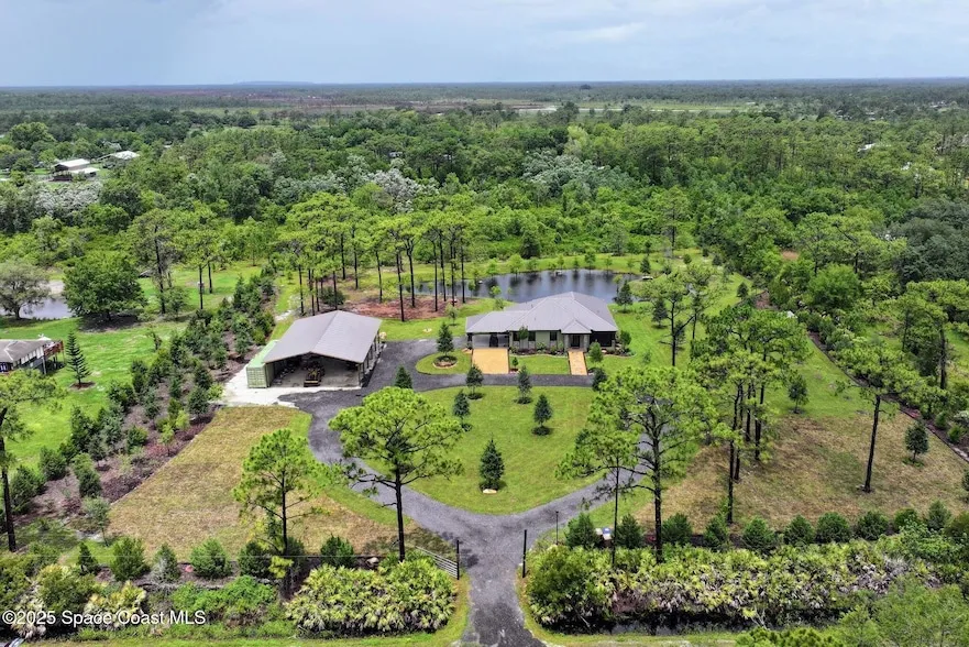 This CBS 2BR/2BA custom home sits on 5 acres featuring a peaceful pond, private island, waterfall, and land bridges. Finished using beetle-kill pine harvested from the property also crafted into one-of-a-kind furniture it blends rustic charm with thoughtful design. Accessibility was prioritized, with a primary bath and a deep soaking tub in the guest bath. Triple sliding doors invite the outdoors in, offering serene views. The kitchen and bathrooms feature granite counters and knotty pine accents. An oversized utility room includes a built-in dog wash. The property boasts a 40x60 pole barn, two RV hookups, and room to grow. Surrounded by over 300 trees, it offers privacy and frequent wildlife sightings. Located at the end of a quiet road in an agricultural zone with no HOA, and bordering a Wildlife Management Area enjoy total tranquility while still being close to the Space Coast, Orlando Airport, Theme Parks, and Beaches.