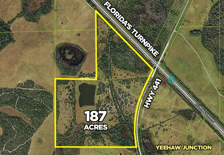 This beautiful 187-acre Old Florida land is filled with wildlife. Sit by your own lake and watch the deer and turkey wander by or launch your kayak and take a leisurely paddle around the lake. This beautiful property would make an ideal spot for a country estate, family compound, or a weekend getaway. Located at the Florida Turnpike/State Road 60 exit at Yeehaw Junction - only 30 minutes from Vero Beach and central to all major Florida markets. Features 2700 feet of frontage on the Turnpike with 3 income-generating billboards and a half-mile of frontage on US 441/Kenansville Rd. Owned by the same family for over 40 years.