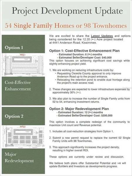 Option 1: Cost-Effective Enhancement Plan - Estimated Duration: 6 (+-) months - Estimated Seller/Developer Cost: $40,000 This option focuses on achieving significant cost savings while slightly enhancing project yield. 1. We are working on reducing infrastructure costs by: • Requesting Osceola County approval to only improve Anderson Road up to the project entrance. • Relocating the retention pond to enable dual frontage along the project's main access road. 2. These changes are expected to lower infrastructure expenses by approximately 30% (+-). 3. We also plan to increase the number of Single Family units from 52 to 54, enhancing investment returns.