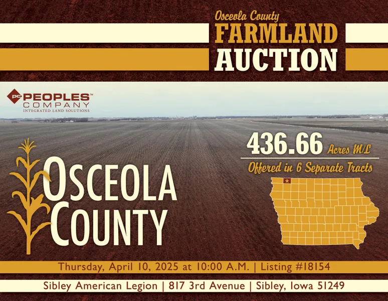 Osceola County, Iowa Farmland Auction Mark your calendars for Thursday, April 10th at 10:00 AM CST! Peoples Company is pleased to represent the Gordon and Joan Jettie Trust in the sale of 436.66 acres M/L in Osceola County, Iowa. The farm consists of six tracts of very productive, tillable farmland located near Sibley, Iowa in Osceola County, Iowa.