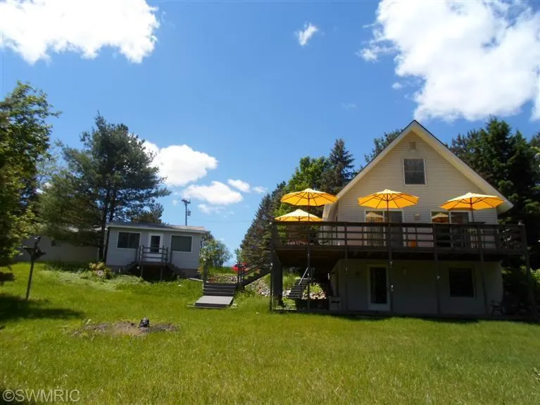 Immaculate Chalet on almost six acres of land and approximately 600 feet of frontage on the Muskegon river. detached guest house, 2 car garage, newer windows and new roof July 3, the setting is very private yet so close to town. This is a one of a kind property in top notch condition!