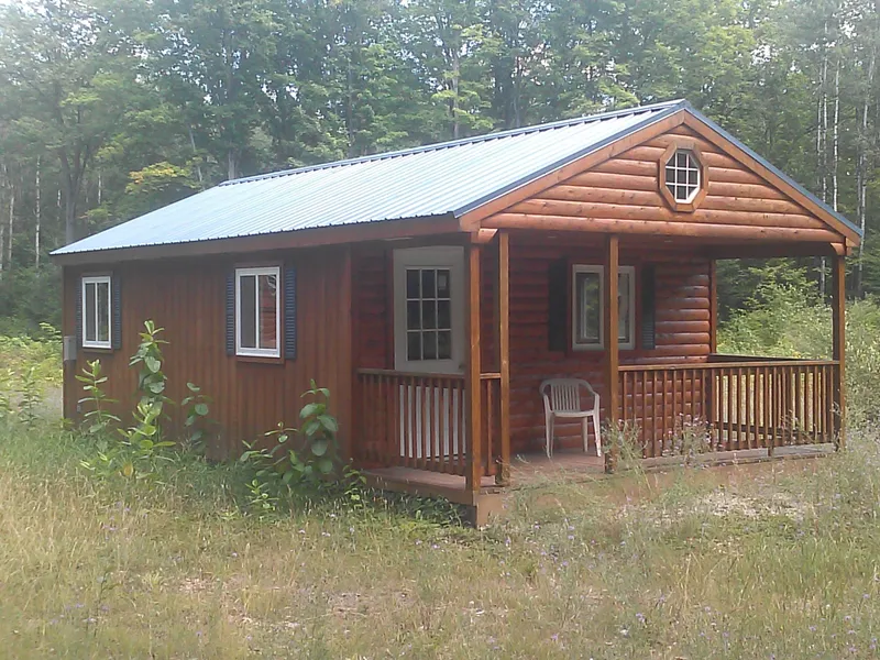 CABIN & TEN ACRES- This parcel is a square ten acres in a very desirable location. The cabin is half log siding exterior and knotty pine interior. Also has a storage shed to match. There is an older travel trailer with addition that needs some work but might be used as a guest cabin. $ 32,000 A-2389