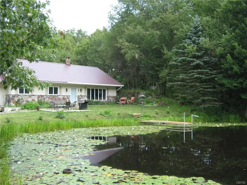 Beautiful private park like setting on a large pond. 2.5 bedroom home could expand to 3 easily. Over sized 3 car garage and large newer barn provide plenty of storage great for owners who have many vehicles. Home has open floor plan and was designed as an energy efficient bld. Central air and aux. wood stove. If you are looking for peace and quiet here is your answer.