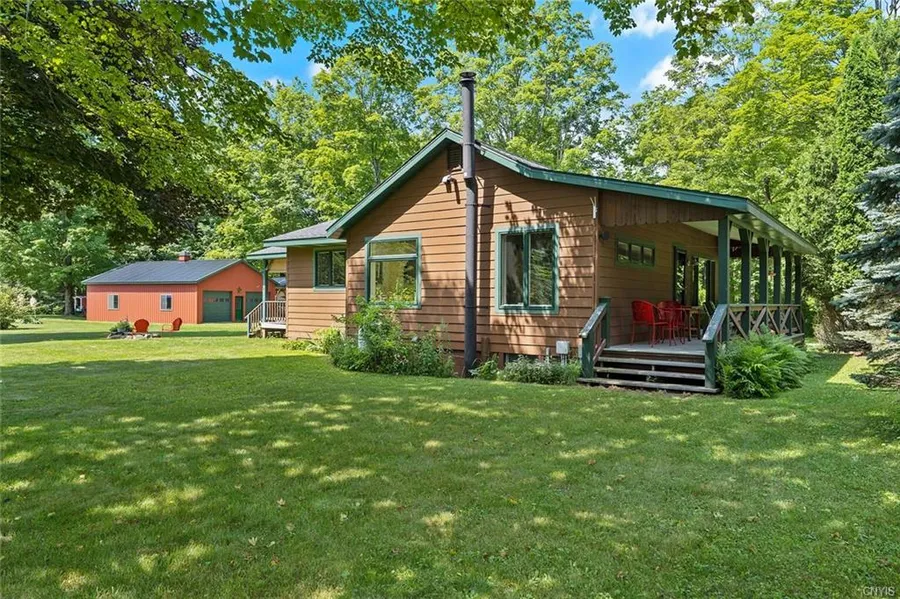One of a kind ranch home nestled on a peaceful 5+ acres with several outbuildings. 28x40 detached 2 car garage with 2 additional rooms. 28x56 building, the front part is a heated area with a man door and an 8 ft overhead door. The back has a large unheated space with double sliding barn doors. 16x38 open pole barn w/30 amp service. 9x26 lean to shed, 12x12 greenhouse, 10x10 garden house, a large chicken coop, a large fenced in garden area. The home has a beautiful open concept, hardwood flooring in kitchen, dining and primary bedroom, luxury vinyl flooring in the bathroom, living room and 2nd bedroom. Pocket doors, black walnut bar, birds eye maple built in desk are just a few of the amazing elements of this home. Within your pantry you will find a spiral staircase leading to your root cellar and partially finished (always dry) basement. Lots of new updates: roof, windows, doors, insulation, plumbing, electrical throughout, appliances, bathroom, kitchen to name a few. There is a lovely porch on the front as well as the back plus a bluestone paver patio. This property is in a quiet area conveniently located near I-81 for an easy commute, great hunting, fishing and snowmobiling.