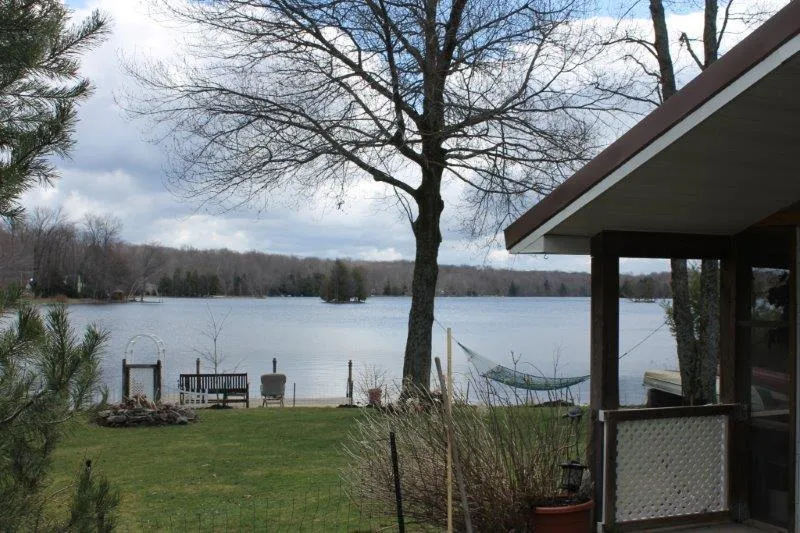 This two story home has several unique features with a drop down living room, gas fireplace, walk out covered and screened balcony for relaxing close to the waters edge. The kitchen is a modern breakfast bar with granite counter tops, custom vaulted ornamental ceiling. There are three bedrooms, one on the main floor, a second separate bedroom is in the original A-frame, and the master bedroom is upstairs on the second floor along with large, walk in, cedar closet and with hot tub on balcony overlooking the water. Two and half baths, hardwood floors, central air conditioning, redundant heating system designed for efficiency with a propane furnace and pellet system. This home was designed perfectly for comfort, serenity and reliability. VIEWS OF WATER from most rooms!
