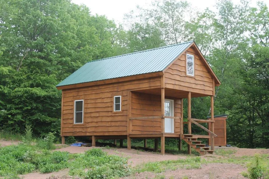 16 x 20 footprint with 8 x 16 overhanging porch providing 16 x 16 of loft space up stairs. Entire cabin is insulated and is finished pine on all walls. First floor has comfortable kitchen area, futon, tables and very comfortable feel, clean and smells great. Wired for generator, very clean build with sandy soils for easy hiking and no mud!