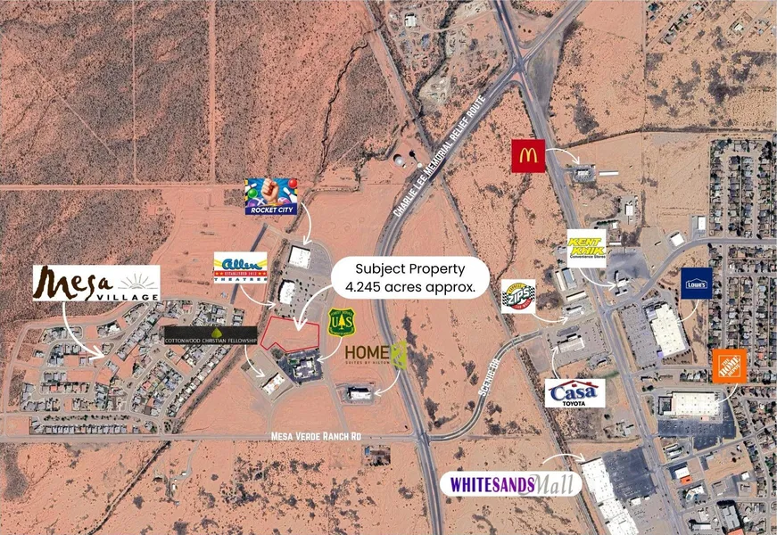 Positioned at 3591 Mesa Village Dr, this 4.245-acre parcel offers a prime opportunity within Alamogordo's thriving Mesa Village Development. Boasting significant frontage along Mesa Village Dr., the property ensures excellent visibility and accessibility. KEY FEATURES: SIZE: Approximately 4.245 acres. LOCATION: Frontage on Mesa Village Dr. SURROUNDING BUSINESSES: Allen Theaters, Rocket City Family Fun Center, US Forest Service, Home2 Suites Hotel, Cottonwood Christian Fellowship Church. FUTURE DEVELOPMENTS: Proximity to the planned Otero County Courthouse. UTILITIES: Available nearby. ZONING: Commercial, Business C-3 District. This property is ideal for retail, office, hospitality or mixed-use development, benefiting from the area's steady growth and the influx of both local and visitor traffic. The surrounding amenities and upcoming developments enhance its appeal, making it a strategic...