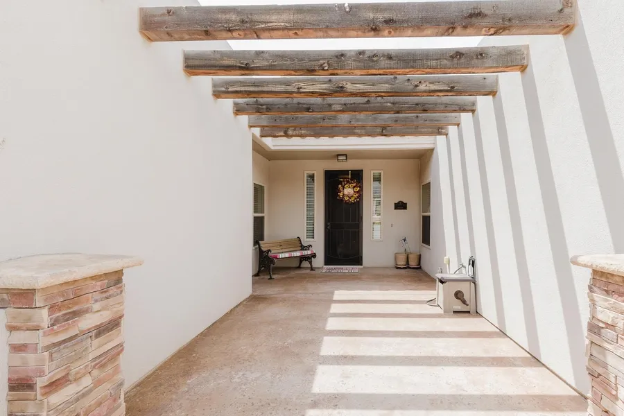 Welcome to this stunning 4-bedroom home that blends timeless Southwest charm with modern comfort and functionality. Step inside to discover elegant features such as built-in shelving, decorative niches, and warm stone accents. The expansive kitchen is a cook’s dream—equipped with custom cabinetry, granite countertops, stainless steel appliances, a spacious pantry, and two islands for effortless prep and entertaining. The private primary suite is your personal retreat, offering a spa-like ensuite bathroom with a dual-sink vanity, a spacious tiled shower, a soaking tub, and a large walk-in closet. For added convenience, a direct door connects the suite to the laundry area. A versatile office space—perfect as a fourth bedroom—connects through the hallway, while the home’s south wing hosts two additional bedrooms and a full bath. Enjoy seamless indoor-outdoor living through a large multi-slide patio door that opens to a backyard oasis. Take a dip in the sparkling 8 x 34' heated in-ground pool or relax by the outdoor fireplace under the expansive covered patio. The front courtyard and porch, framed with classic Southwest-style wood beams, make for a charming first impression. Additional highlights include a 3-car garage, RV parking on the north side, Energy-saving sunscreens on windows and back patio, Security doors for enhanced airflow and low-maintenance landscaping in both front and back yards. This beautiful home is designed for comfort, beauty, and effortless year-round living. Come experience the best of Southwest living—schedule your private tour today! Copy and past link to the virtual tour