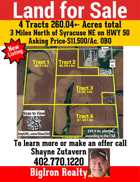 Description of Property: Here is your opportunity to own some very productive farm ground with excellent development potential located right on HWY 50, just north of Syracuse, NE. Sellers prefer to sell all tracts together but will entertain offers for individual tracts.