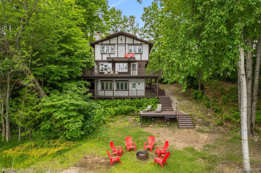 184'lake frontage of All-Sport Big Lake in Gaylord! Immaculately maintained 4 bedroom 4 bath three level Chalet style home nestled in a lovely park-like setting with beautiful new composit decking to enjoy the stunning lake and wooded views. Complete with 2 wood burning fireplaces, 2 family rooms, updated kitchen with newer floors, backsplash and granite counter and appliances, fully remodeled wet bar with granite counter, fully finished walk out lower level with spacious family room (wood burning fireplace) , new bath and fourth bedroom with egress window. Enjoy the open concept main floor with wood burning grand stone fireplace with new mantel and walk out to your extra large raised patio to extend your living space. The upper level houses the expansive primary suite complete with en suite bath, vanity, walk in closet, and private balcony as well as two other bedrooms (with private bal...