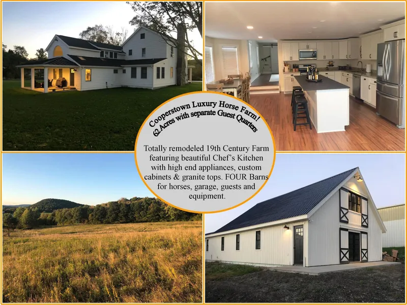 COOPERSTOWN EQUESTRIAN ESTATE Meticulously remodeled 3 BR, 2.5 Bath, 19th Century Cooperstown Farmhouse on 62 gorgeous acres. No expense has been spared in this home. Spacious Chef's kitchen with high end appliances(Stainless), Cabinetry, Granite counters, 8 foot center Island. Open Floor Plan into Light & Airy Family Room w/ high windows, Vaulted Ceiling, hardwood floors, and to the Formal Dining Rm w/ hardwood floors, Barn-door style sliders to Covered front porch. Beautiful, bright Living Rm w/ impressive stone Fireplace. Half Bath and Office. Second fl. features Master Ensuite w/ Jacuzzi tub, shower, Walk in Closet, Large, BR w/ vaulted ceiling, Dressing area. 2 Additional BR's + Guest Bath. Whole house generator.4 Barns: # 1 of which has 3 car garage, extra storage above, 30' X 26', Barn #2 w/ 8 horse stalls, Office, Heated Tack Room, 2 wash stalls. Stunning two bedroom apt., on 1st fl. & Studio Apt. on 2nd fl. Barn # 3 has 2 car garage + workshop. 30'x26' Barn # 4 Indoor Riding Arena w/brand new side wall - 70'X 140' Property features Picturesque 62 gently sloping acres, open pasture, and woodland, 3 Paddocks are 30'X100'. The possibilities are limitless- residential, commercial or farm/riding facility. Is on school bus line, so convenient for after school riding lessons. OUTSTANDING LOCATION- minutes to Clark Center, Ommegang Brewery, Main Street shopping, restaurants, Baseball Hall of Fame, and the incredibly beautiful Otsego Lake. as well as the many other Cooperstown attractions.