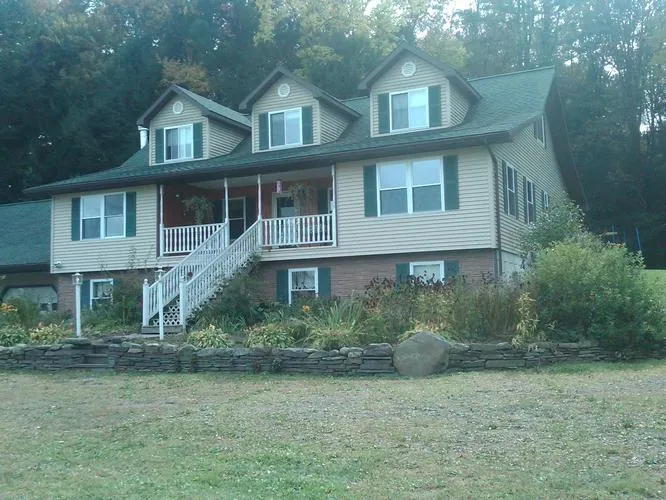 Private 5+bedroom, 3+bath, cape cod with finished walk out basement and 3 outbuildings on 16+acres. Basement Level has 500sq ft finished above grade and 1200sq finished below grade. LL features Family room with fieldstone fireplace, full bath, 2 bedrooms, canning room and utility room, First floor has master bedroom suite with full bath and sitting room with door to private back porch. Also found on the first floor are the kitchen with large pantry, dining room, living room and a den. Kitchen window overlooks a woodland setting, wonderful porch and great play yard. Second floor features two bedrooms on either side of a large open landing room with full bath and lots of storage. Property features an attached 2+ car heated garage with two rooms and a half bath perfect for guest rooms. Also, 30x40 two story barn, insulated, heated (radiant heat installed, also a conventional woodstove, elec...