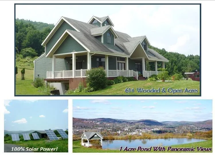 Eco-friendly UPSTATE NY home with a MILLION $$ panoramic view on 61+ Acres! Open floor w/40' vaulted ceilings with MAGNIFICENT views from EVERY ROOM . Gorgeous kitchen w/soapstone counters, top end appliances, walk-in pantry. Master suite w/gas fireplace, steam shower, soaker tub and sliders to private deck on MAIN floor allows for one level living. 3 more bedroom suites each featuring full private baths and sitting areas, 2 with cathedral ceilings& hardwood flooring. Huge familyroom/media, exercise room, wine cellar and root cellar. Home features LIFE BREATH SYSTEM, radiant heat, maple hardwood flooring and 100% SOLAR POWERED. NEVER pay for electric again! 2 car attached garage w/radiant heat & extra storage leads to paved driveway and 3 barns. Historic 1810 barn with studio apt totally redone with radiant heating, including barn. 2 ponds, stocked w/bass & Koi, gazebo w/beach area. All ...
