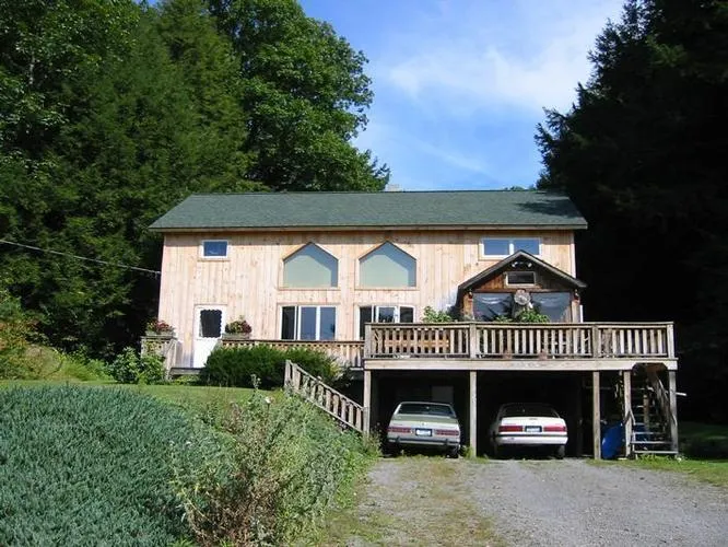Wonderful open floor plan in this spacious rustic feeling home with soaring cathedral ceiling with open beans and sky lights. Solid oak floors throughout most of house, great windows and light. Large Master Bedroom, with sitting area, exterior balcony, two lg. closets. Two full baths one on each floor. Enjoy the privacy of the back yard and screened in porch while listening to the babbling stream or take a short walk up to the large pond and enjoy some solitude.
