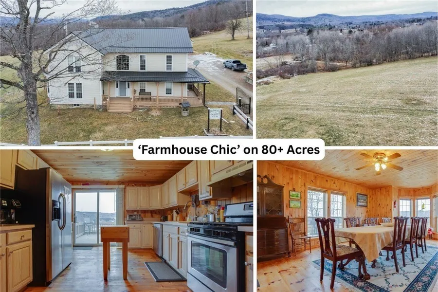 Modern farmhouse chic set on 80+ acres! With 3400 square feet of warmth and character, this farmhouse offers the perfect blend of privacy, recreation and the possibility of income! Featuring a cozy fireplace, a grand living room and a seamless layout ideal for everyday living this can be your forever home or a second home with savvy investment. The kitchen is spacious, inviting and provides ample storage; it leads into a dining area that's perfect for gatherings or quiet dinners. Downstairs, there is also a very large room convenient for anyone needing a first floor bedroom. The wood accent walls and ceilings bring a rustic charm into this wonderful space! Upstairs, there are five more bedrooms, including a larger room with en suite full bath. There is an additional full bathroom on this level as well for comfort and convenience. Relax and take in the breathtaking views from the wraparou...