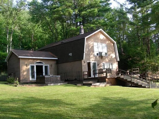 On the west side of pristine Buck horn Lake, this lakefront, year round, private, 4 bedroom, 2 1/2 bath home is perfectly set for long sunny days & amazing sunsets. The level yard leads out to your own private dock. This clear motor boat and water sport lake is spring fed and surrounded by acres of wildlife refuge and holds the NYS record for the largest Bass. Wake up in front of the romantic gas stove and amazing views of the lake in the master bedroom. The lake front hot tub sits outside of the double sliding doors of the large family room with cathedral ceiling & skylight. A pellet stove sets the ambiance on a cold winter's day. Large modern kitchen w/oak cabinets is fully equipped & ready to welcome friends & family. The bright living room w/brick wood burning fireplace leads to lakefront tiered decks and patio. Two level driveways make the house easily accessible. A detached 2 car g...
