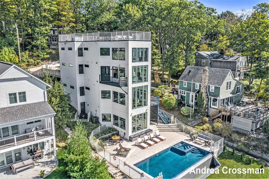This is the definition of waterfront-luxury living! Contemporary Lake Michigan home with panoramic views from 23 rooms on 4 levels. This stunning home has an expansive terrace to entertain guests, features a 17' x 30' heated infinity pool and hot tub which overlooks the private beach. Included in the 5,000+ square feet of living space are 3 full kitchens, fitness center, surround sound theater, 500+ bottle wine cellar, and 4 king-size master suites. Features include central vac system, 3 washer/dryer sets, 3 tankless gas water heaters, heated floors, infrared saunas, heated driveway, wheelchair accessible transparent elevator with lake views, and a built in Bose sound system running through the entire home. This home is uniquely designed to entertain extended-stay guests.