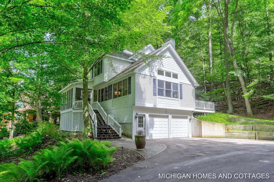 Fully renovated home in Forest Beach with deeded access to Lake Michigan only 200 yards away. Perched in the woods, and protected by dunes, this comfortable home was built with the lake life in mind. Open spaces combined with elegant finishes, you will love the flow of this home, and spending time on the screened in porch, or entertaining on the back deck. Many newer upgrades to this home, including a whole home generator, wood flooring, amazing tiled bath with a steam shower, newer furnace, AC unit, and water heater, all new landscaping, including fire pit, epoxy flooring in the garage, and the list goes on! Let in the natural light through the ample windows, and watch nature while cozying up to the fireplace. A rare 3 deeded beach access points ensure lasting lakeshore memories.