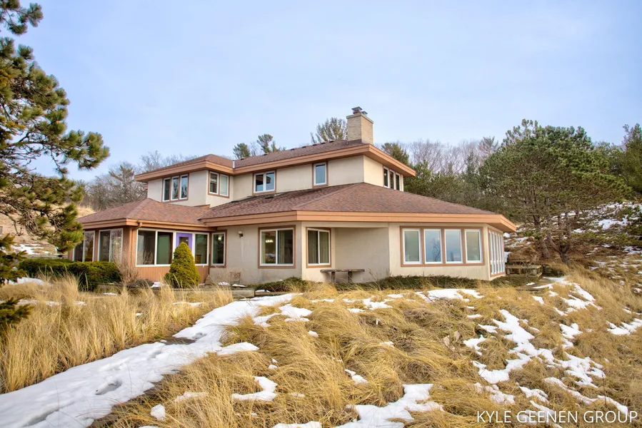 Discover your dream home with stunning views of Lake Michigan and 300 ft of water frontage! Situated on 8+ acres of coastal land in a gated community, this private retreat offers a spacious deck for grilling and outdoor entertaining, while enjoying breathtaking views of the dunes and lake. The interior boasts a warm and welcoming atmosphere, complete with a stone fireplace, bright west-facing windows, and a spacious kitchen featuring beautiful butcher block countertops. With four bedrooms, a bonus room, and two sunrooms, theres plenty of space for guests to relax and enjoy the serene surroundings. Dont miss out on this once-in-a-lifetime opportunity to own your own slice of paradise - schedule an exclusive tour today! Also listed as house and lot separate: MLS IDs: 23005494 & 230054'