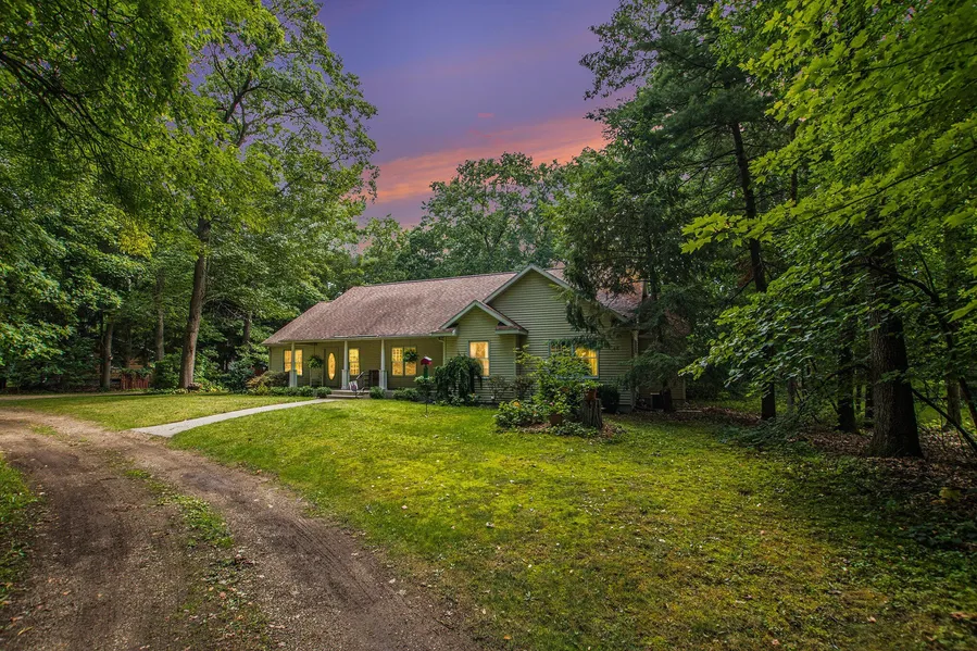 This custom built residence is situated on a secluded and private 3+ acres in Grand Haven Township. The House has an attached private guest suite with its own kitchen and entrance and bedroom suite. The main house features 3 bedrooms and 2+ baths and could also have a home office space. Enjoy the living room / primary suite gas log fireplace. There's a total of 5 bedrooms and 3.5 baths making this a great home for that family member or friend to have their own separate wing. You'll find plenty of room to roam on the 3.28 acres of woods and trails, all located near Millhouse Bayou and the Grand River boat launches. The lower level has unlimited possibilities with a bath and bedroom and family room down - plus additional room for storage. There's also an additional two-car garage detached garage for storing all your toys.
