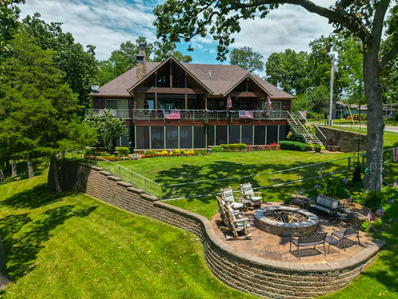 ONE OF A KIND ON MONKEY ISLAND! This Luxurious Rustic Retreat offers a Beautiful Custom Waterfront Home with a ton of GORGEOUS detail. 5 BR/5 BA, 2 car attached garage w/storm shelter. Gourmet kitchen, double ovens, gas range w/hood, large farm sink, island sink and microwave. Rock fireplace& wood beams in great room. 2 laundry rooms (upper & lower). Outdoor living space. 1200 sf upper deck with cook station, fireplace and TV. Fully screened 1200 sf lower deck. Outdoor fire pit, 2 slip boat dock (32'X12' and 28'X12'), 2 Jet docks, swim deck, fish cleaning station, &storage. Total of 385 feet of shoreline. Awesome 1200 sf Detached Entertainment Room complete with 3/4 bath and a 480 sf Carport. No HOA. All of this right around the corner from Shangri-La Resort and all that Monkey Island offers!