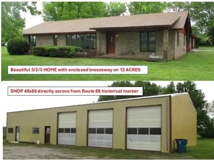 This charming home has an open floorplan, lots of windows and storage space, a large covered patio leading to a 3-car garage, and beautiful mature trees, Features include a well, natural gas, access to city water, and enough space for farming /livestock. COMMERCIAL ACREAGE includes over 900l' of highway frontage for endless business opportunities. It borders 2 roads, 1 mile from Interstate 44, 1/2 mile from a major intersection and Buffalo Ranch Travel Center and Truck stop, and a short distance to Grand Lake of the Ozarks. The SHOP has a 4-post car lift, office-retail space, and ample parking. A Route 66 historical monument is across the highway. See write-up in photos for additional details. Most see to appreciate!