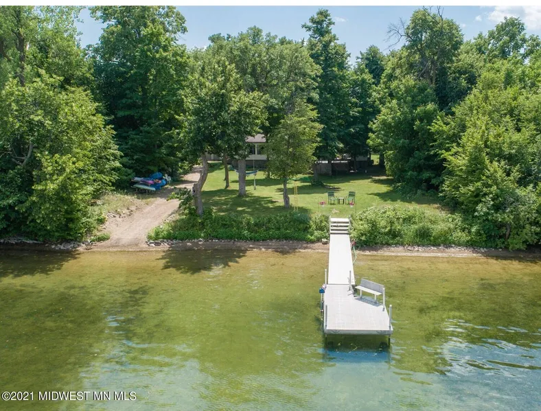 ROUND LAKE ... private, beautiful, and serene. 150+ feet of walk-in sand beach on .94 acres. Privacy created by a lot lined with trees in a park-like setting. This 1800 sq ft year-round home all on one level offers 3 bedrooms/2 full baths and includes a master bedroom suite w double walk in closets. New flooring installed in the 2 guest bedrooms, guest bathroom nd kitchen. DONT MISS this 32x48 HEXUM STORAGE BUILDING with a garden center, a workshop and upper and lower storage, 3 large doors and a drive out to the lake for a pontoon or other boats. Also unique are the two separate rooms for entertaining; both a family room and a living room. The kitchen boasts of an open concept, two pantries and a breakfast bar for informal dining.All with walls of windows views to the lake from inside or on the large lakeside patio. Gorgeous trees year-round and garden creates a perfect setting for both a lake, private and rural feeling all on a dead-end road. Precious and peaceful! Dont delay ... it can be yours today!!! Appliances and dock included