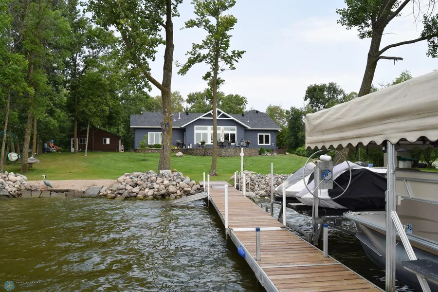 Exactly what you have been dreaming of-a stunning lake home 45 minutes from Fargo. Lakeside wall of windows overlooking a beautiful patio with a lush lawn and landscaping leading to a sandy beach and dock area. Large open floor plan, oversized kitchen island including a separate pantry. Convenient main floor laundry room next door to a 3/4 size bath with separate entrance to outdoors. 2 bedrooms with main bedroom ensuite. The loft area accommodates a large sleeping area with a 1/2 bath with additional room for games and tv. Oversized 1120 sq. ft. attached heated garage and a 600 sq. ft. heated toy storage building make this family friendly for everyone!