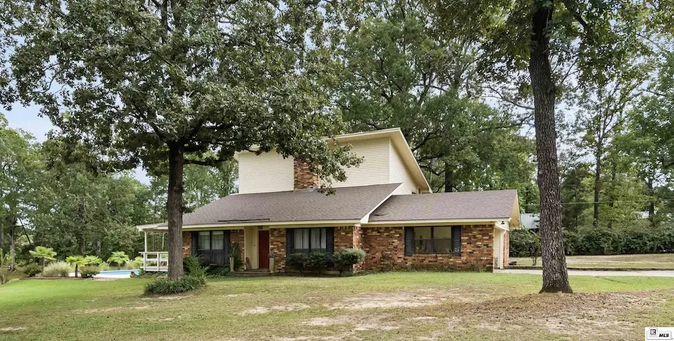 Step into this beautiful home and be greeted by a stunning floor-to-ceiling brick fireplace that serves as the centerpiece of the home. To the left, you ll find a spacious living area filled with natural light from large windows one offering a perfect view of the covered back porch with ceiling fans, plenty of seating, lush landscaping, and a gorgeous in-ground pool. Beyond the pool, enjoy the peaceful setting with a small pond and 2.5 acres of land to explore. To the right of the entryway is the designated dining area featuring exposed wood beams and large windows that let in plenty of light. On the other side of the grand fireplace is the kitchen, complete with tiled countertops, a stove and microwave setup, and an oversized bar with extra seating perfect for entertaining. Just off the kitchen are two bedrooms that share a conjoined bathroom with a stand-up shower. Down the hall, you ll find access to the laundry room and a two-car carport. Upstairs offers a cozy sitting area overlooking the living and dining rooms, plus a unique converted attic loft space. Two additional bedrooms upstairs each include walk-in closets and share a connecting bathroom. Outside, the property continues to impress with a concrete driveway, an RV carport, and a convenient half bath by the pool. Connected to the pool deck is a two-story lofted workshop, approximately 380 square feet ideal for hobbies, storage, or additional workspace. This home combines comfort, functionality, and peaceful country living, all set on 2.5 acres.