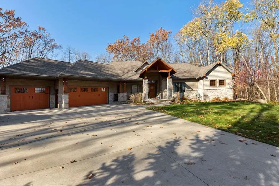 Custom built walk out ranch on 2.5+acre wooded setting w/privacy & serenity. Craftsman exterior; professional landscaping. Inside find modern materials to bring this open concept design to life. Views of private lot throughout. Great room w/beamed ceiling & wood burning fireplace. Kitchen w/dual islands, white quartz, modern lighting, SS appliances, warming drawer, walk in pantry, wine fridge. 3 seasons porch w/wall of windows, gas fireplace, built in outdoor grill and access to raised deck. Custom double doors to master suite includes office. LL wet bar, custom patio, 3rd fireplace. Amazing!