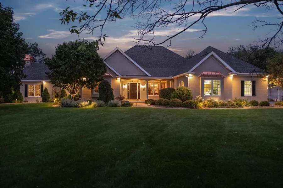 A private oasis awaits you in this custom home nestled on 3.49 +/- acres with lush landscaping, wooded backdrop, & private pond w/ fountain! An inviting floorplan provides a large kitchen with built-in appliances, granite, snackbar, and two dining options, along with a cozy Hearth Rm with wood burning FP! The remarkable addition to this home offers a bar area & huge living rm with backlit arched beams, stone FP, & double doors leading to the screen porch with built-in heaters overlooking pond! Primary suite with remodeled bath has large soaking tub & tile shower, 2 closets, & private patio access. The LL is finished with rec room, bedroom, exercise rm, & second suite! Attached heated garage with stairs to LL, detached heated garage, generator system, sprinkler system, & security system!