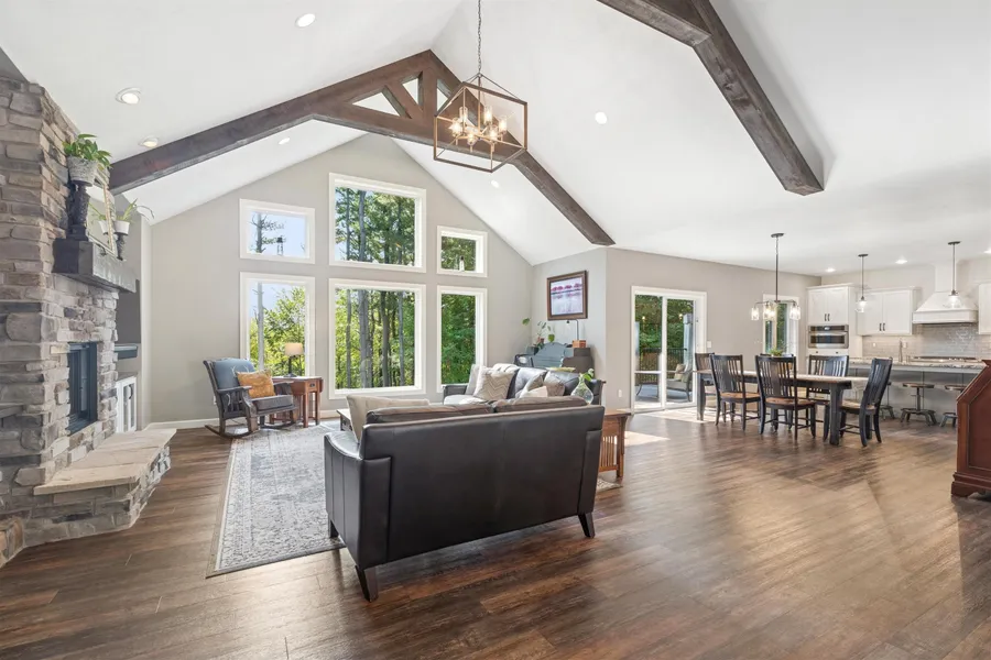 Prestigious former Parade Home situated on a serene 2.65+/-acre wooded lot! Step inside to be welcomed by soaring ceilings in the living rm, flowing seamlessly into the dining area and gourmet kitchen, all overlooking stunning backyard views. The main flr offers a spacious primary bedrm suite with a walk-in closet, a private bathrm with dual sinks and tile shower. Desirable home office or additional bedrm, 1/2 bath and convenient laundry area complete the main level. Walk-out LL is designed for versatility, featuring 3 bedrms with walk-in closets. One bedrm includes its own private suite bath and living area-perfect for an in-law suite, along with another full bath. Enjoy a spacious family rm with direct access to the private yard, making this home ideal for both relaxation and entertaining