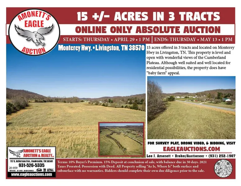 15 acres offered in 3 tracts and located on Monterey Hwy in Livingston, TN. This property is level and open with wonderful views of the Cumberland Plateau. Although well suited and well located for residential possibilities, the property does have "baby farm" appeal.