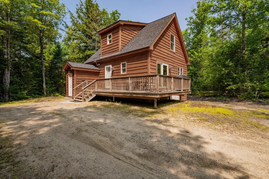 The mountains are calling! This cute-as-a-button chalet is truly turnkey and ready for you. It's the perfect size for a park-and-play, lock-and-leave lifestyle. Featuring 3 bedrooms (including one on the first floor) and 2 full bathrooms, this home offers a bright, open-concept layout with the kitchen, dining, and living areas seamlessly connected. A slider off the living area leads directly to the deck for easy indoor-outdoor living. The first-floor bathroom conveniently includes laundry. Upstairs, you'll find two additional bedrooms and a full bath. The unfinished daylight basement offers excellent potential- think game room, bunk space, or added living area. Set on a private lot with a firepit, the home also comes equipped with a state-of-the-art hot tub and an on-demand Generac generator for peace of mind. To top it off, the property includes a deeded right of way to the Androscoggin...