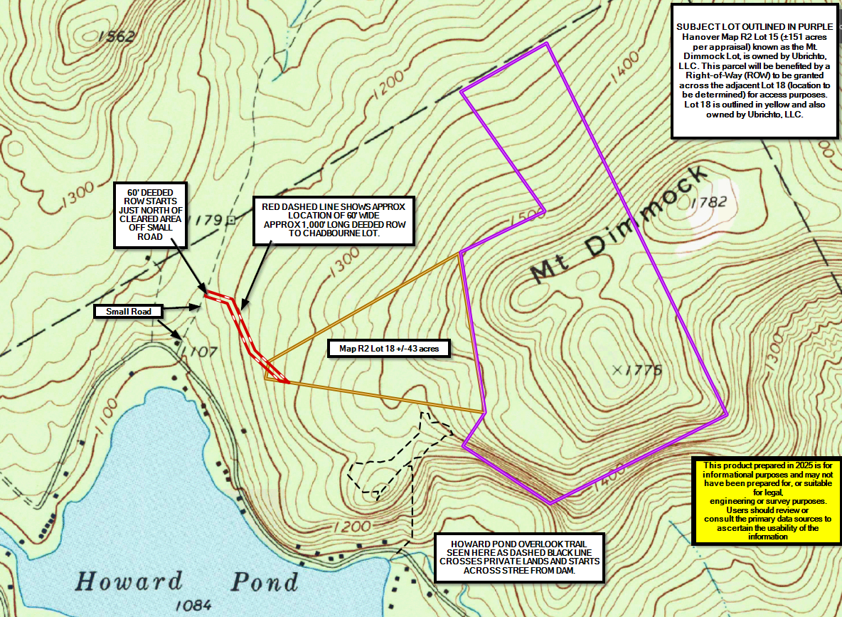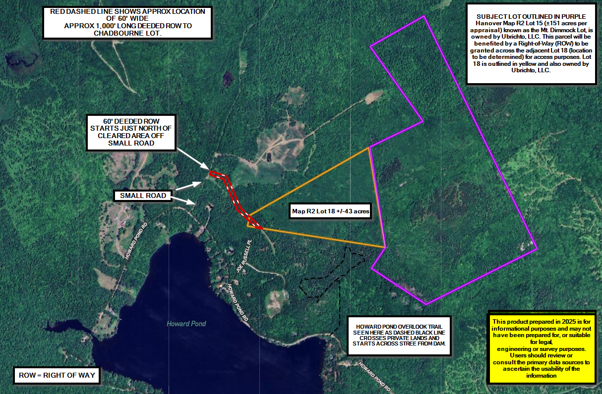 Access is by a 60-foot-wide, 1,000-foot-long deeded right-of-way leading to the southwest corner of the abutting Chadbourne Lot (43 acres, also offered for sale by the same owner). The Chadbourne Lot will be encumbered by an additional 2,000-foot ROW extending east to serve the Mt. Dimmock Lot.