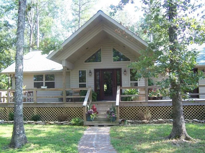 This home is all about the huge fireplace and designer windows. The architectural design of this home, features the floor to ceiling designer windows and fireplace, in living room and dining room. Enter this beautiful circle drive, adorned with tall oak trees, and step into the front entrance. You won't believe your eyes... you're standing here in the living room featuring catherdral ceilings with huge oak beams. Can lighting and fans . Custom high gloss finish, solid wood floors... The dining room , located on the south side of home, has a gorgeous view of the Ozark Woods and Wildlife, off your rear deck. The kitchen is a Gorgeous Galley kitchen style. 18' x 8' size. Solid Wood floors. Can lights. Designer Galvinized ceiling. Abundant cabinets. All appliances, includes washer and dryer, included in sale of home. Home has solid wood doors. Central Heat and Air. Gas Fireplace. Backyard has Chain Link fence. 2 car garage. Master bedroom has Garden Tub and shower and beautiful vanity. . Bedroom has walkout french doors to deck. 5 acres is wooded. Many, many large oaks and tall pines. 18'x18' basketball pad in front yard. Abundant wildlife Here! 2 miles off paved road. Appx. 16 miles to Gainesville. Also, close to Ava and Mtn. Grove. Close to Norfork and Bryant rivers. Minutes to Bull Shoals lake. Come enjoy the country living in a fine home: Fishing, Hunting, 4-Wheeling, canoeing or just sittin on the front porch....Motivated seller...Designer Country Home...NEW LOWERED PRICE....$198,500