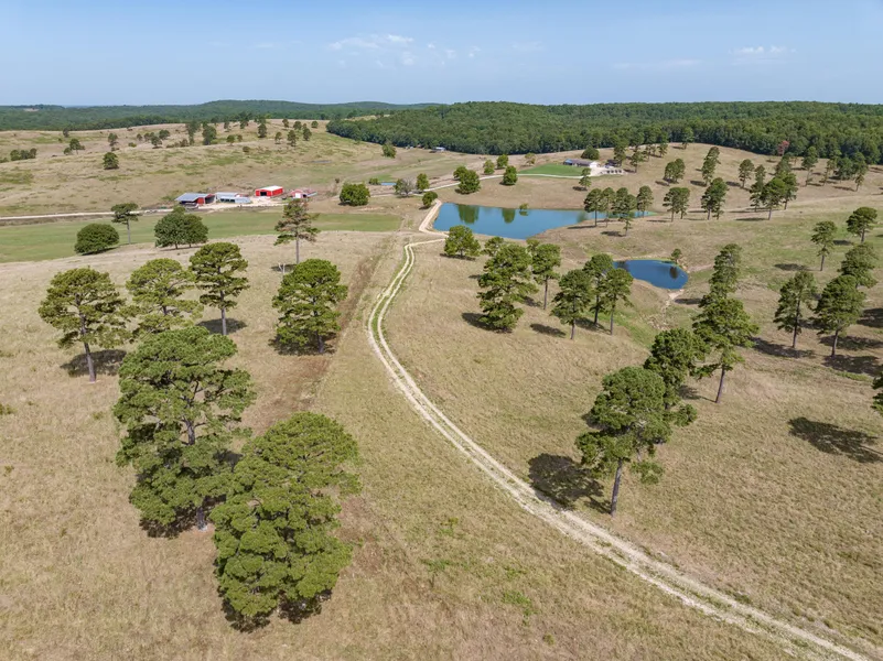 This 1753 +/- acre property is conveniently located just off Highway N north of Gainesville. The property offers approximately 750 acres of open pastures with great views in all directions as well as approximately 1000 acres of mature timber with trails, springs and food plot areas for recreation and hunting. The 4 beds, 3 bath earth-berm home built in 1993 is 1.1 miles off the highway and sits high on a hill and overlooks most of the property. The home offers a large open kitchen, formal dining room, walk-in closets, large 2-car garage and so much more. The home is serviced by dual fuel heating with both electric and an outdoor wood furnace. Barns and outbuildings include a 48x70 red iron equipment building built in 2020, 44x70 with 24' overhangs on both sides commodity building built in 2010, 50x60 with 16' overhangs on side and rear insulated shop with concrete floors and LP and wood heat, 2 livestock barns with cattle working systems and pipe corrals, 34x 104 hay barn and 24x 70 equipment barn. North of the main buildings is a sow farrowing barn with slatted floors and 16 farrowing crates. Most of the fencing has been done since 2005 with the oldest stretch being built in 1995. The fencing and cross-fencing is 5 strand barb wire mostly with pipe corners and have been designed for easy flow of cattle from the corrals to all pastures by one person. The property has multiple ponds and lakes as well as automatic waterers for ample water for livestock. The wooded portion of the property is a hunter's paradise with cleared trails throughout. There are a multitude of food plot areas as well as places to build a cabin. The east side offers a 3-level spring that is over 20' tall and flows year-round. This property offers opportunity for several different applications and is a must see.