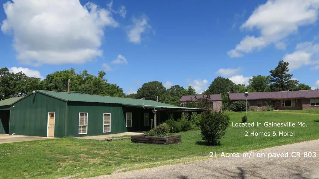 Opportunity, multiple homes and/or investment property to lease with income potential. 21 Acres on paved CR 803 in Gainesville, Mo. 2 homes, 2 gar. plus storage barn. Home #1, brick, 4 bed, 2 bath, Liv., Kit., Utility, large cov. Back patio, det. 2 car garage. Home #2, metal building, 2 bed, 2 bath, fam. rm., kit., liv. Rm. utility, covered breezeway to det. 2 car gar. & shed. Separate driveway to massive 90 x300 barn. Live in 1 home, lease the other and lease barn. Multi family or income possibility. This property is located in Gainesville, Ozark County, MO.