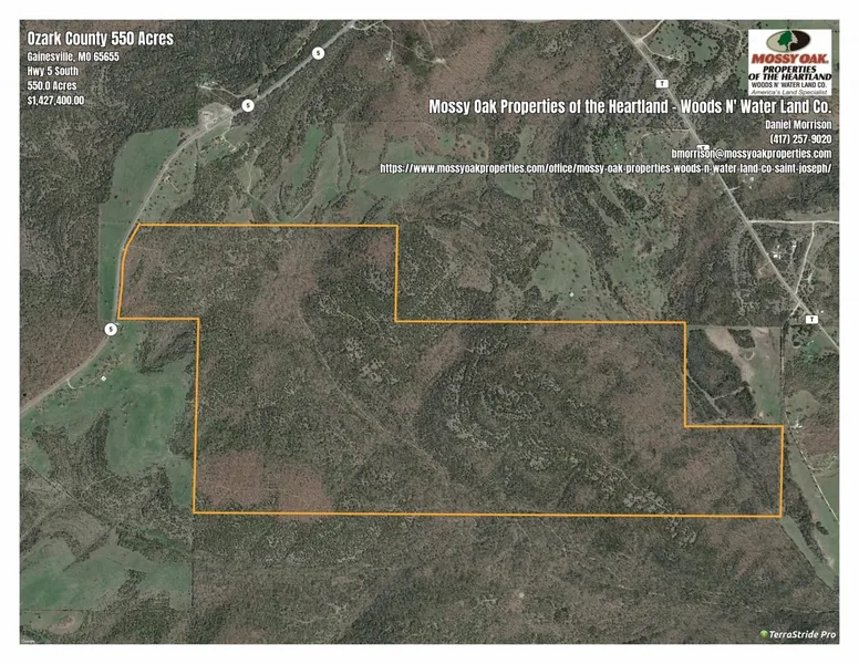 PRICE JUST REDUCED!... !!... NOW JUST $2350 PER ACRE!!!!....Beautiful Ozark County timber property just minutes from Bull Shoals Lake. This 550 acres m/l is located just South of Gainesville, MO in the Timber Knob area with almost 1/4 mile of road frontage on Hwy 5.