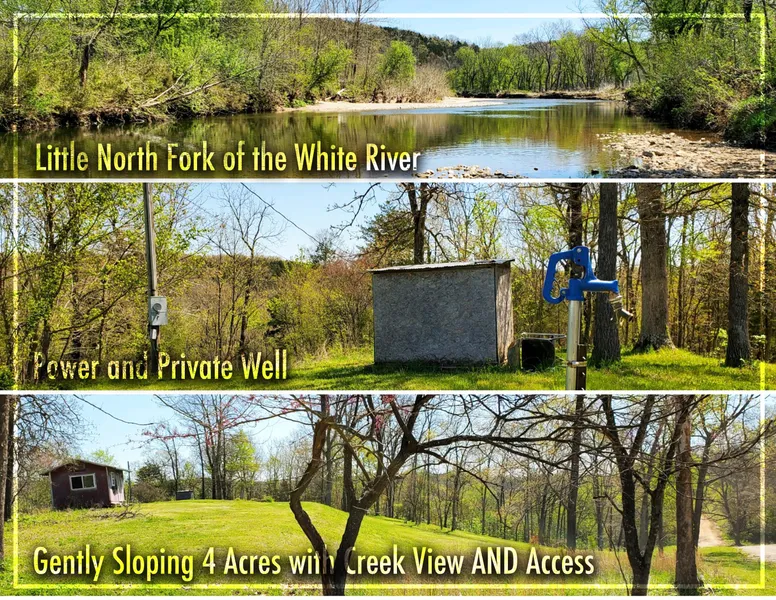 The Little North Fork of the White River is a scenic creek that can be floated most months of the year and fished for bass, perch, etc. Just 20 minutes to Bull Shoals Lake and Theodosia, just over an hour to Branson and hour 20 to Springfield. Owner will consider financing with down payment.