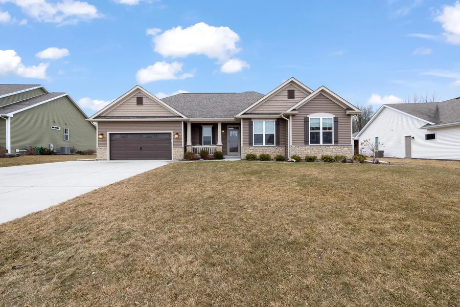 Nestled into the welcoming Village Green subdivision. The professional landscaping invites you into this newly built 3 bedroom ranch. A natural stone fireplace, wood floors and quartz countertops grace this bright and tasteful home.Tiled bathrooms. First floor laundry. The master suite with walk-in closet, shower and large tiled jet-tub complete the main level. Lower level is plumbed for a future full bath and ready for your creative ideas! Extra deep garage for your toys. Concrete drive, patio and sidewalks compliment the maintenance free exterior. Minutes from the interstate. Just in time to enjoy the summer with the family in your new home!
