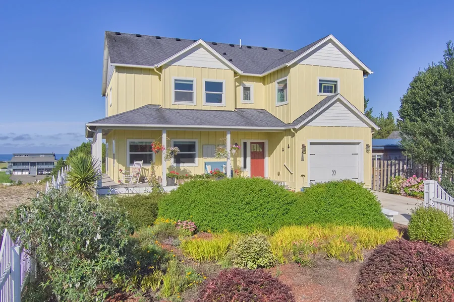 Ocean view garden sanctuary! Ascend the ridge to your modern farm house at the seaside. Ocean facing great room with vaulted ceilings and a wall of windows and slider to expansive deck. Savor the scraped hickory floors glowing throughout this custom light filled home with views from both floors. Watch the sunsets and crab boats as you warm yourself by the fire, or cook in the exquisite kitchen with granite countertops, cherry cabinets, propane downdraft cooktop with pot filler. Enjoy your beverages on the west deck, or on the comfortable sunrise facing porch overlooking the garden. Luxurious primary suite with heated bath floors, 2 more bedrooms and a den downstairs, plus garage and workshop. Turn key serenity awaits!