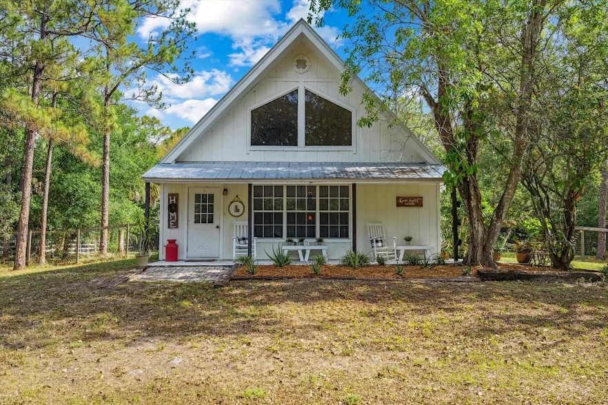 Tucked away on a quiet street in Jupiter Farms, this cozy A-frame home offers the perfect blend of natural beauty, functional updates, and laid-back Florida living. Surrounded by nature and set on 1.20 acres of fully fenced land, the property is ideal for those who appreciate space, privacy, and versatility. The interior features soaring vaulted ceilings and large windows that flood the home with natural light. The kitchen is modernly updated with white cabinets, stainless steel appliances, and an open layout that flows into the living area. A designated dining space and small island with a breakfast bar make it both functional and inviting. Wood-look tile flooring adds warmth and durability throughout the main level. The master bedroom is upstairs with updated