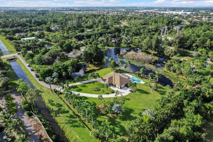 Beautiful large ranch style home on a gated 2.5 acre lot with a huge private lake (no HOA; 180 water view; stocked bass and lots of wildlife) - just minutes from downtown, PBI Airport and the Polo Center. Enjoy an expansive floor plan with high ceilings, new natural wood flooring (very large living room with lake view; all bedrooms are oversized) and new outdoor entertainment area (salt water pool, hot tub, outdoor kitchen). The property is zoned AR, can add more buildings/dwellings to the property. Professional Design Plans are available to the Buyer or use our services to create your own. The house has an extra large driveway, a 2-car garage at the main house plus a separate detached 1 car garage.