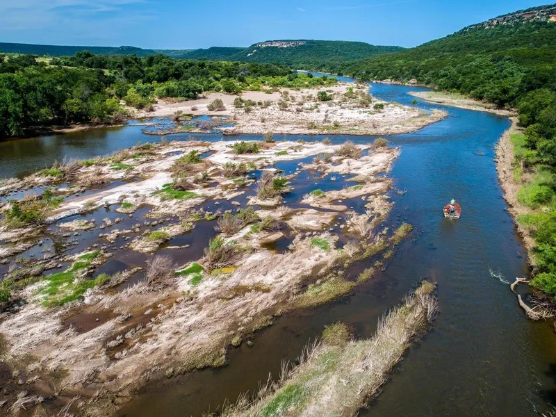 The Fortune Bend Ranch has approximately 4.8 total miles of Brazos River frontage and lies in a teardrop less than 4 miles south of the dam at Possum Kingdom Lake. These are some of the most scenic parts of the Brazos River in north Texas south of Possum Kingdom dam. The river varies from deep to shallow rapids and is mostly wide with some small islands along the way. The historic Ioni creek enters the Brazos River at the most southern tip of Fortune Bend and the sand and silt that has flowed into the Brazos for the last millennia.