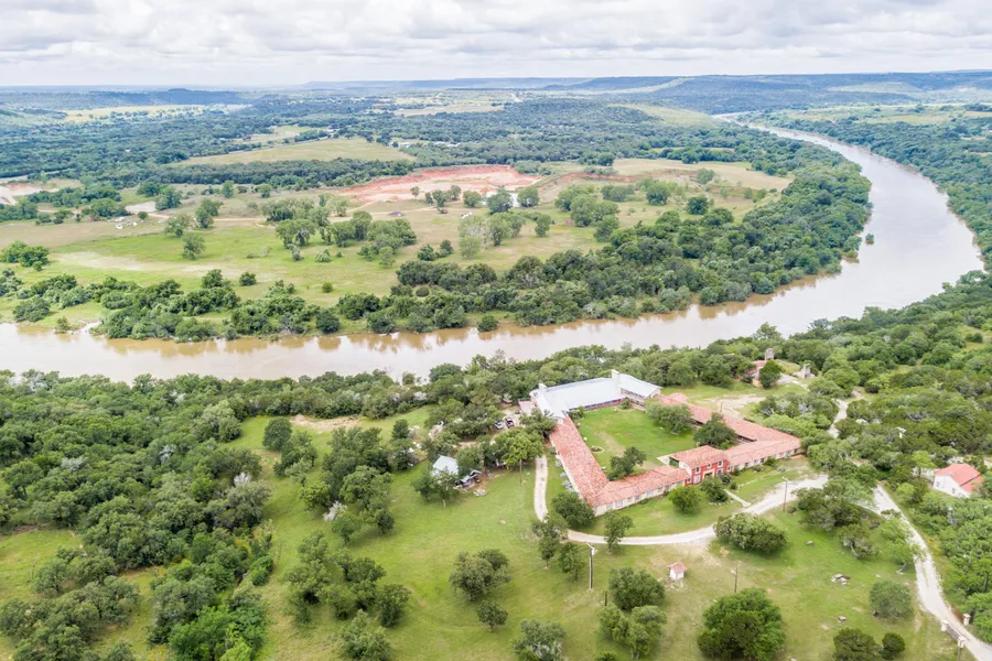 The main lodge is a 1940s Spanish style compound built of stucco and cedar situated on 14+/- acres overlooking the Brazos River. The structure was designed by Dallas architect Charles Dilbeck. Originally a dude ranch, the lodge has 19 guest rooms, 15 rooms have been renovated, and 2 apartments on the second floor surrounding a courtyard, and an 8,000 square foot great room with a full kitchen and bonus room. The fully air-conditioned great room at the Four River Lodge is able to accommodate a small concert, a business retreat, or a family reunion sit-down dinner for 50 with ease. This beautifully lit hall has ample access from both the 200-foot veranda and the courtyard guest rooms. There are 3 other houses on the property, one with 2 bedrooms, and two additional one-bedroom homes.