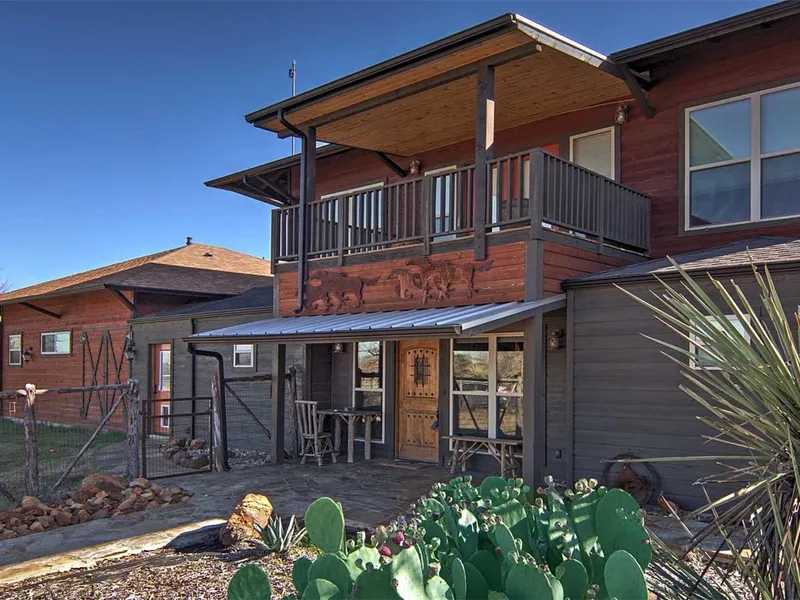 Presenting "Rancho Cielito Lindo", a landmark gentleman's ranch in the North Texas Hill Country. The custom home features a fabulous great room with 23' ceiling and fully appointed professional bar and fireplace. The open kitchen & dining area offers comfortable dining near a fireplace, built in refriderator and the appliances you expect. The master suite with fireplace has custom cabinets and a large custom shower all the amenities. Up the beautiful wood spiral staircase, you'll find a self-contained 3 bedroom suite with kitchen, laundry and easy balcony access. Much of the fine rock a wood work was sourced from the ranch. Across the courtyard, is a finished multi-use room with bath that can be a media room, gym, gameroom or 4 car garage. The estate boasts a private lake with massive bolders, ponds, barn with shop and hay loft and 6 fenced & gated pastures. The property spans from Stagecoach to Prickley Pear with gates on both ends.