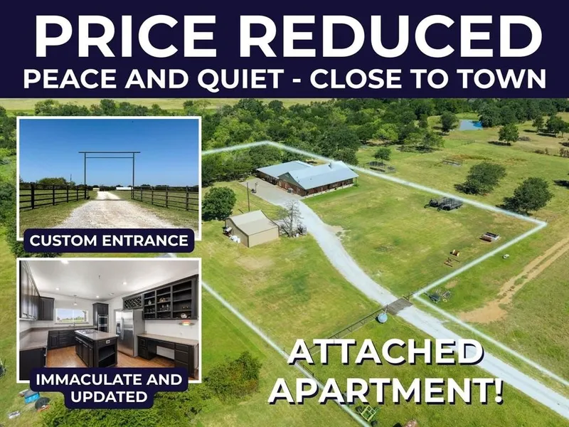 There’s just something about a big, beautiful Texas pipe entrance that says, “I’m home.” Situated on 3.09± peaceful acres, follow the driveway enjoying the country views back to the immaculate 3,900+ sf home sitting just far enough off the road to give you privacy, peace, and quiet. Inside, the home has been thoughtfully updated with granite and solid surface countertops, fresh carpet in the bedrooms, and a spacious custom spa-like shower with a double sink vanity in the main primary bath. At the heart of the home is a huge kitchen featuring a large island, abundant storage, a gas stove, and a double oven — perfect for both everyday cooking and entertaining.