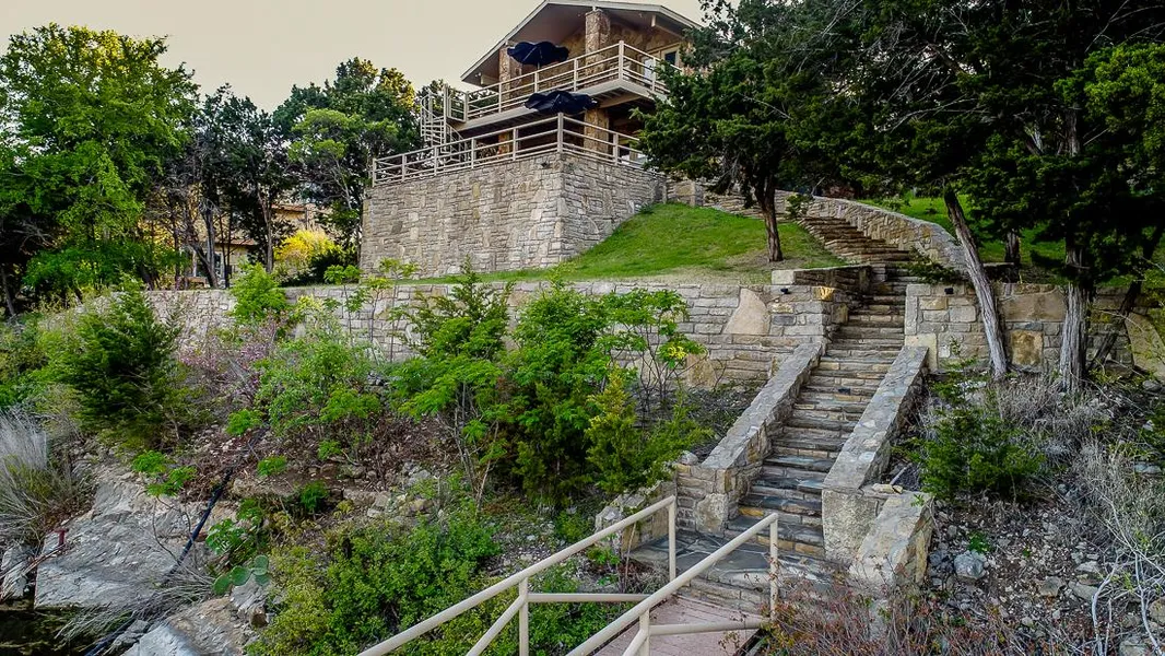 MAJESTIC STONE VILLA sitting hilltop overlooking the secluded waters of Neelys Slough on the south side of Possum Kingdom Lake! You will feel like you are sitting inside an Italian villa hidden away in a little known cove. This PRIVATE lake home, a one-of-a kind gem, is just 40 STEPS from back patio to your personal boat dock with 2 slips, and sundeck to boot! Perfect for tranquil afternoons of fishing or swimming! This 4 BDR 3.5 BATH rock house with huge window views, rests in a quiet cul-de-sac behind a 24 hour guarded gate security entrance. With two spacious balconies and a unique winding staircase to separate the two, this home is perfect for entertaining or family gatherings! A rare find!